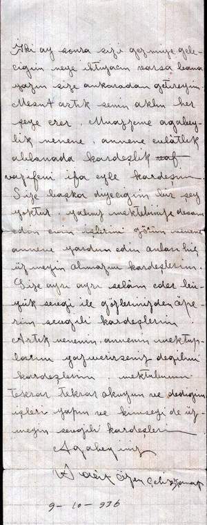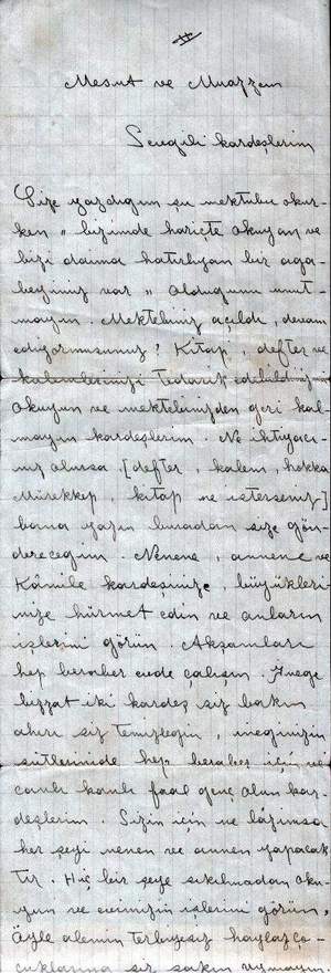 Halit ÖZEN ÇELİKKANAT ın kardeşlerine 1936 yılında yazdığı mektubu anneleri okutmak üzere komşularına götürmüş, orada unutulan mektup yıllar sonra kardeşi Muazzam Bey e ulaşmıştır. |